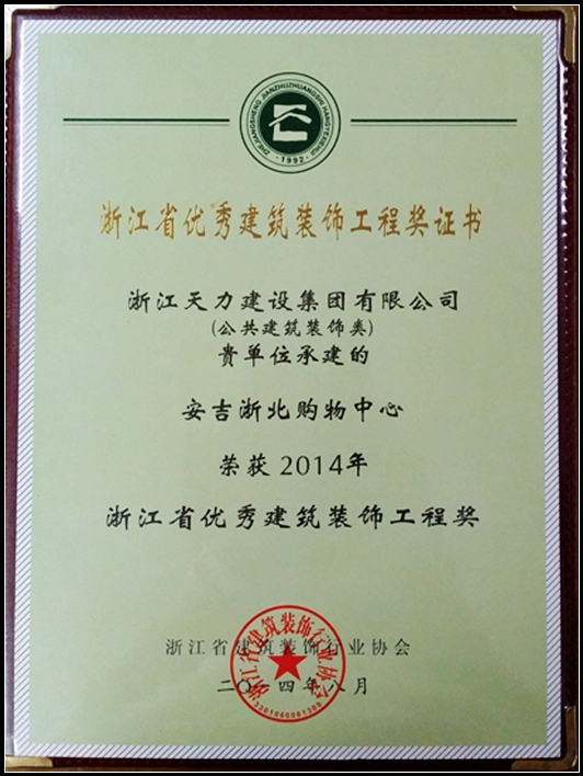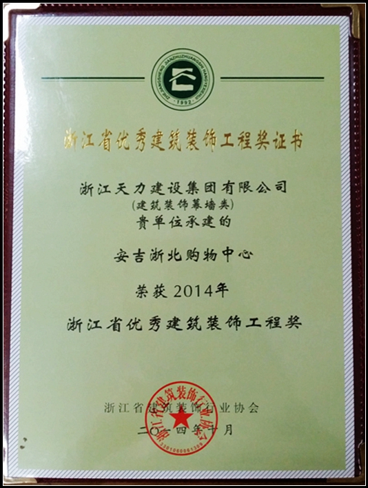 安吉浙北購(gòu)物中心(建筑裝飾幕墻類)、(公共建筑裝飾類)榮獲2014年浙江省優(yōu)秀建筑裝飾工程獎(jiǎng)