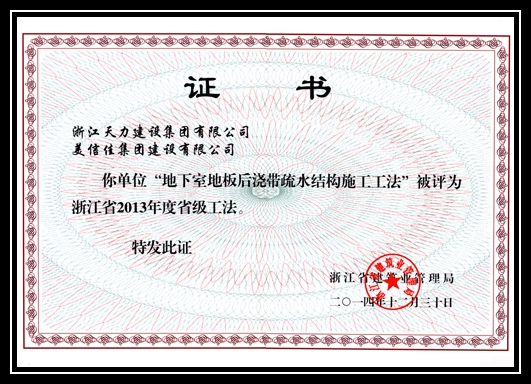 “地下室地板后澆帶疏水結(jié)構(gòu)施工工法”榮獲2013年度省級(jí)工法