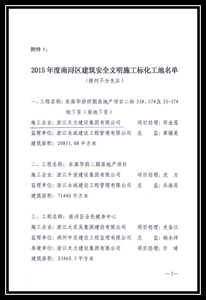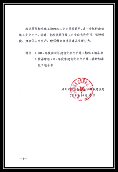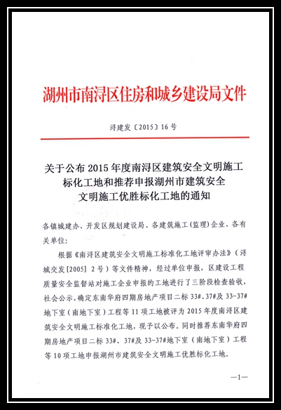 2015年度南潯區(qū)建筑安全文明施工標化工地-東南華府四期房地產(chǎn)項目二標33#、37#及33-37#地下室(南地下室)、南潯金象湖公園商務(wù)會所