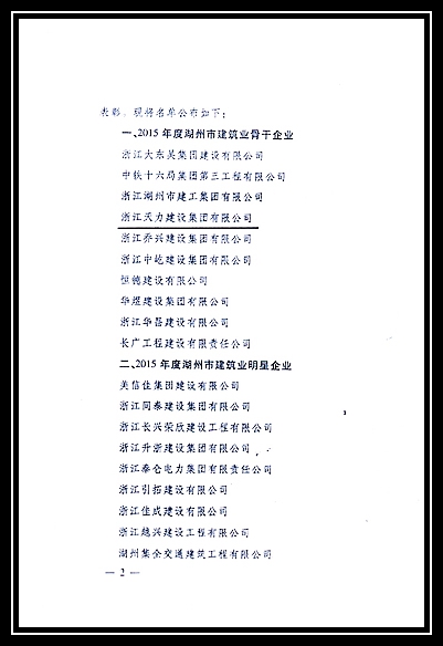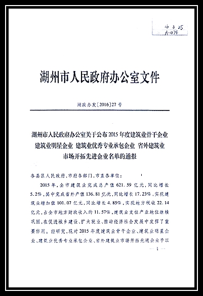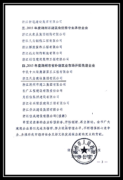 2015年度湖州市建筑業(yè)骨干企業(yè)、湖州市省外建筑業(yè)市場(chǎng)開拓先進(jìn)企業(yè)