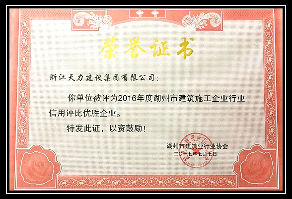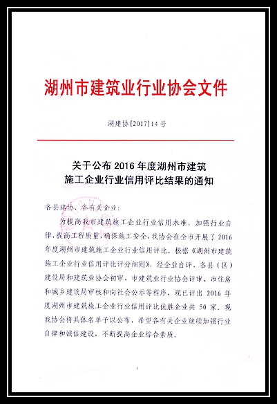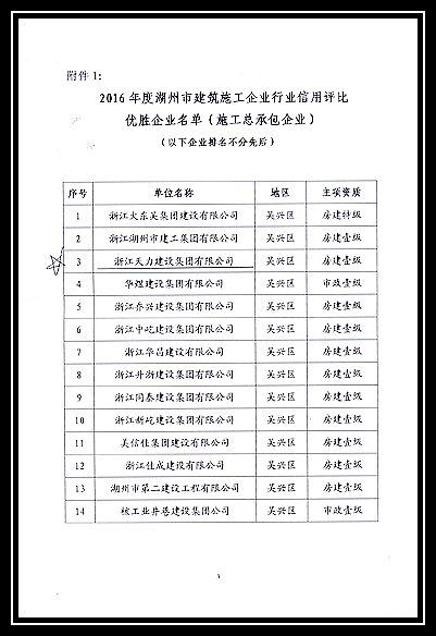 2016年度湖州市建筑施工企業(yè)行業(yè)信用評比優(yōu)勝企業(yè)