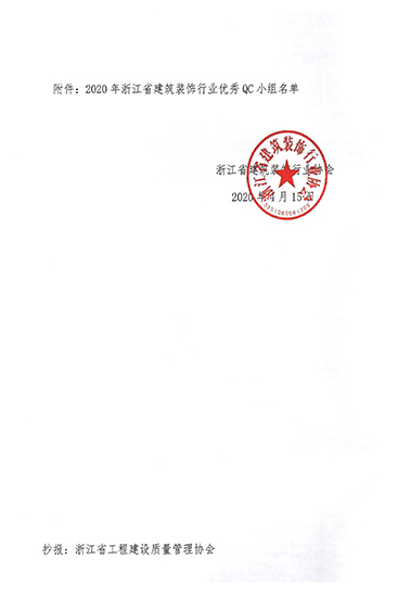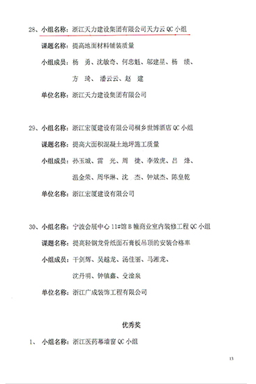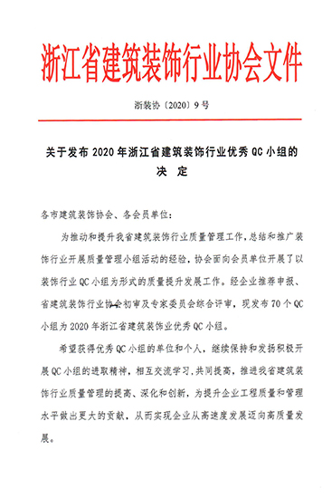 天力云QC小組被評為2020年浙江省建筑裝飾行業優秀質量管理小組二等獎