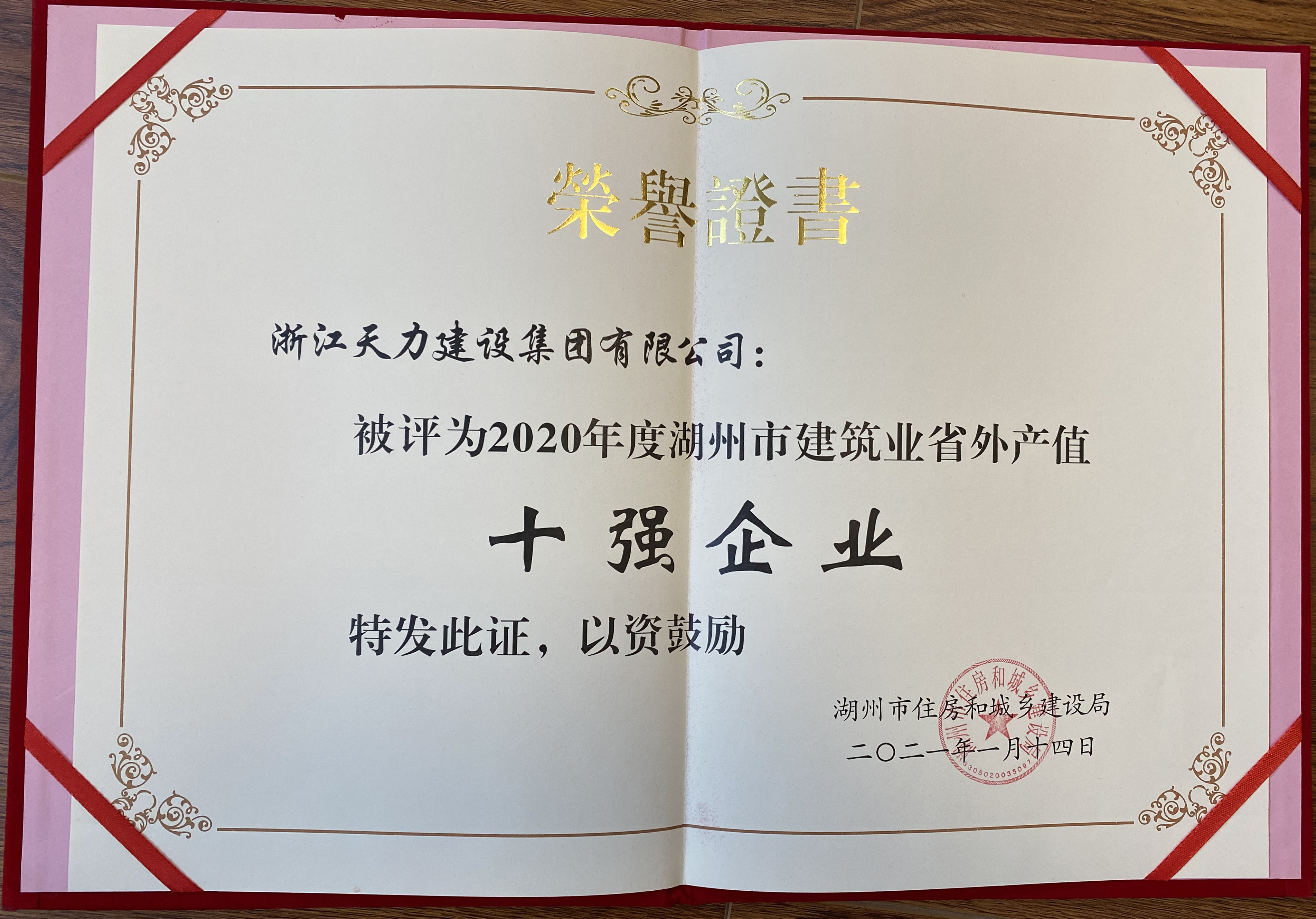 2020年度湖州市建筑業(yè)省外產(chǎn)值十強企業(yè)