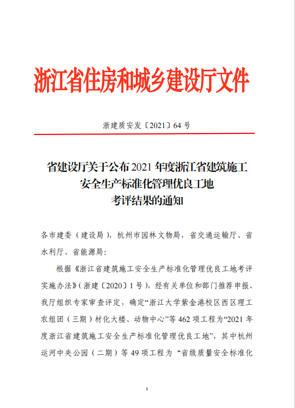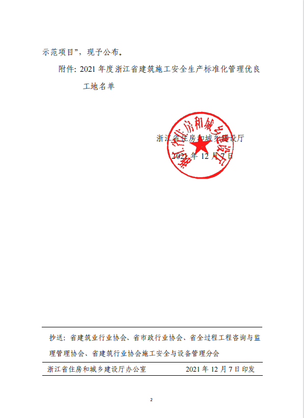 2021年度浙江省建筑施工安全生產標準化管理優良工地