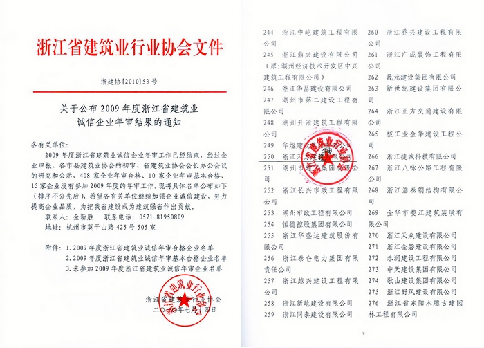 2009年度浙江省建筑業誠信企業