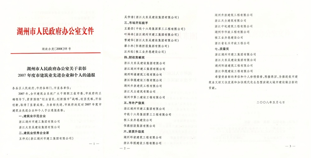 2007年度湖州市建筑業(yè)先進(jìn)企業(yè)