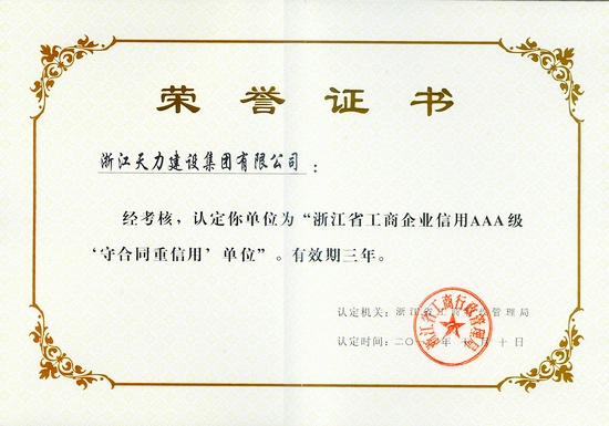 2012年度浙江省工商企業(yè)信用AAA級(jí)“守合同重信用”單位