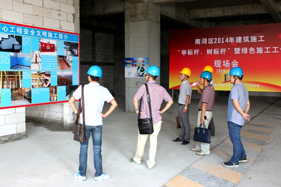 與會人員現場觀摩了南潯區金融服務中心項目安全文明施工和標準化管理的成效,當看到施工場地材料堆放整齊、防護設施到位、防塵措施得當、機械設備進出有序、施工操作規范、生活清潔良好的狀況,大家都對項目各參建方嚴格按操作規程,對工程建設實施標準化管理表示贊賞。