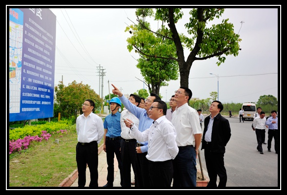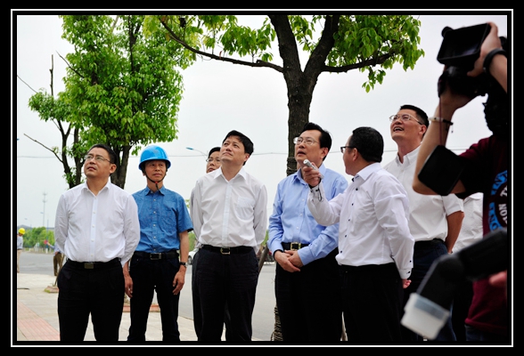 2015年5月6日下午,湖州市委書記裘東耀、吳興區委書記蔡旭昶、區長吳智勇、常務副區長周建新等有關部門領導在公司董事局主席楊虎麟、生產副總經理印培榮的陪同下,視察了我公司承建的高新區現代物流創業中心施工現場。