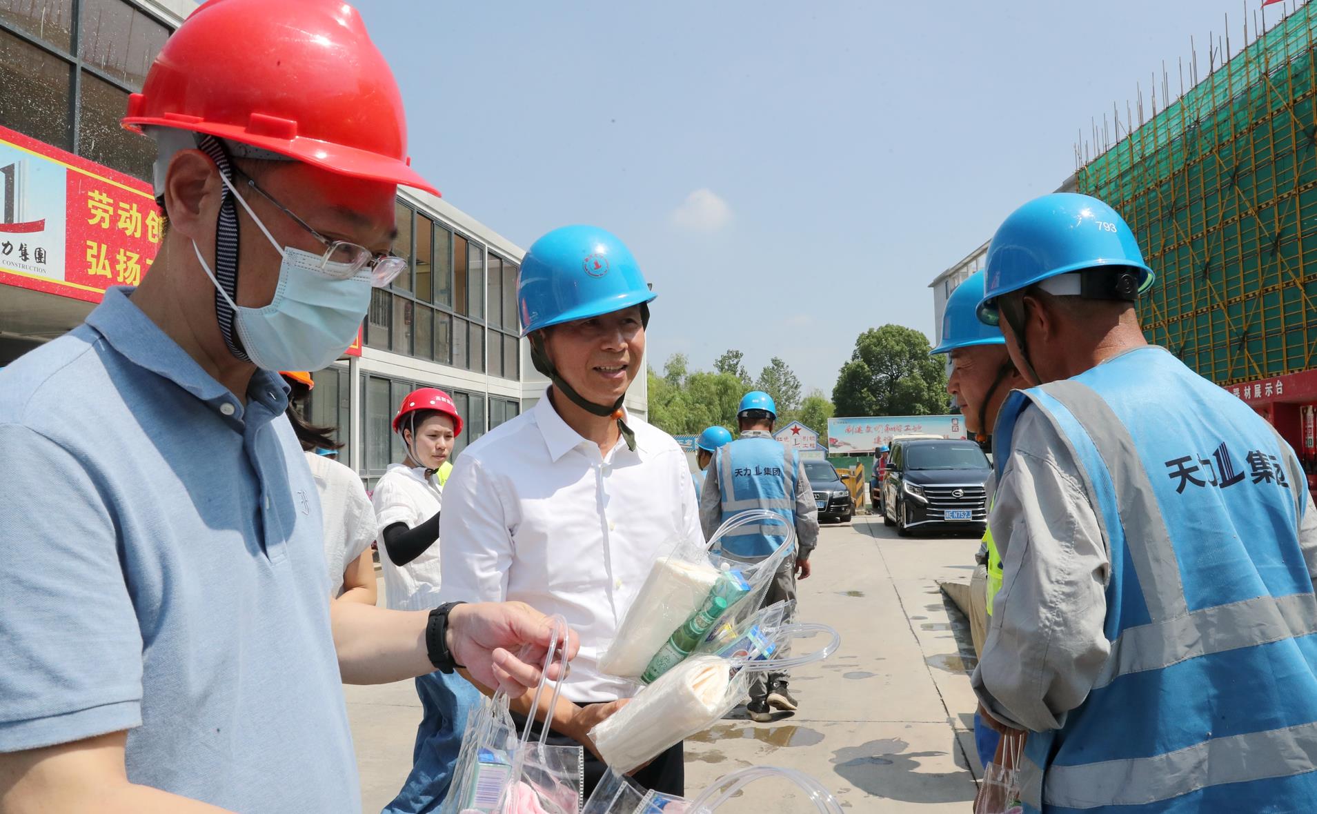 隨后唐局長(zhǎng)一行同天力集團(tuán)楊主席共同慰問了項(xiàng)目一線工人。囑咐大家做好勞動(dòng)保護(hù)和防暑降溫工作,守牢安全底線,注意勞逸結(jié)合,在保重身體、保證安全的基礎(chǔ)上確保工程質(zhì)量、保證工程進(jìn)度。